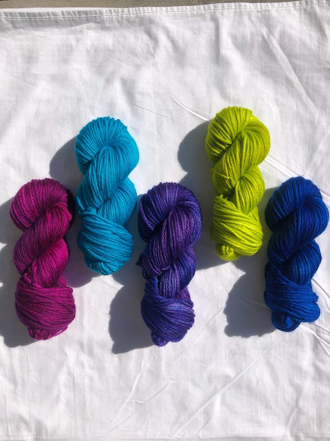 Our newest collection of hand-dyed yarn in bright jewel tones and named after San Juan Islands resident orca family, the J-Pod! Each colorway was inspired by and named after an orca in the pod. The collection was designed to offer both high and low contrast options for colorwork as well as beautiful colors that can stand alone. The collection offers both subtle tonal variations as well as true variegated colorways.