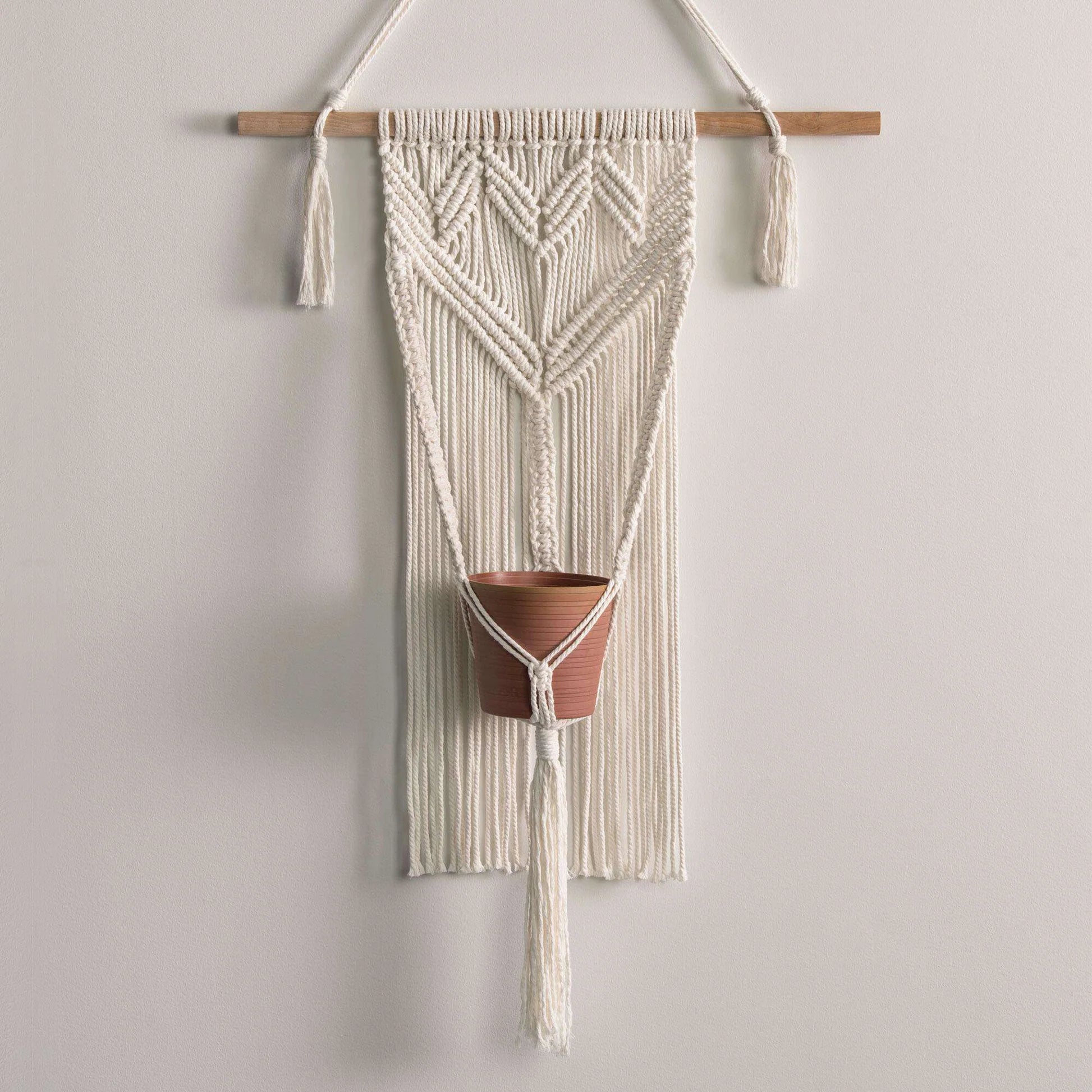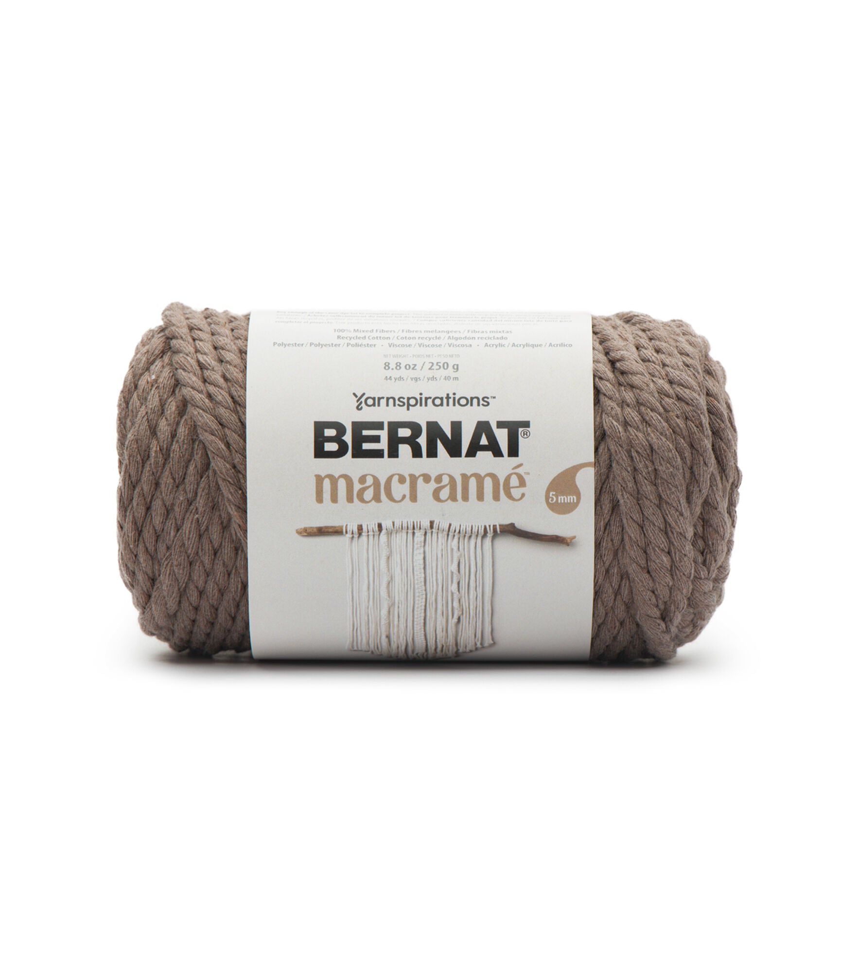 Bernat Macramé is a new Macramé cord made partially with recycled cotton! Each ply in this 3-ply yarn is made up of 30 fine strands that are twisted together. With various neutral and bold shades, beginners and experienced makers alike can make easy no-needle Macramé home décor projects! Bernat Macramé is perfect for adding a stylish boho touch to your home from wall hangings to plant hangers. The cotton content of Bernat Macramé gives it some extra softness, making it more comfortable to work with than other traditional Macramé rope.